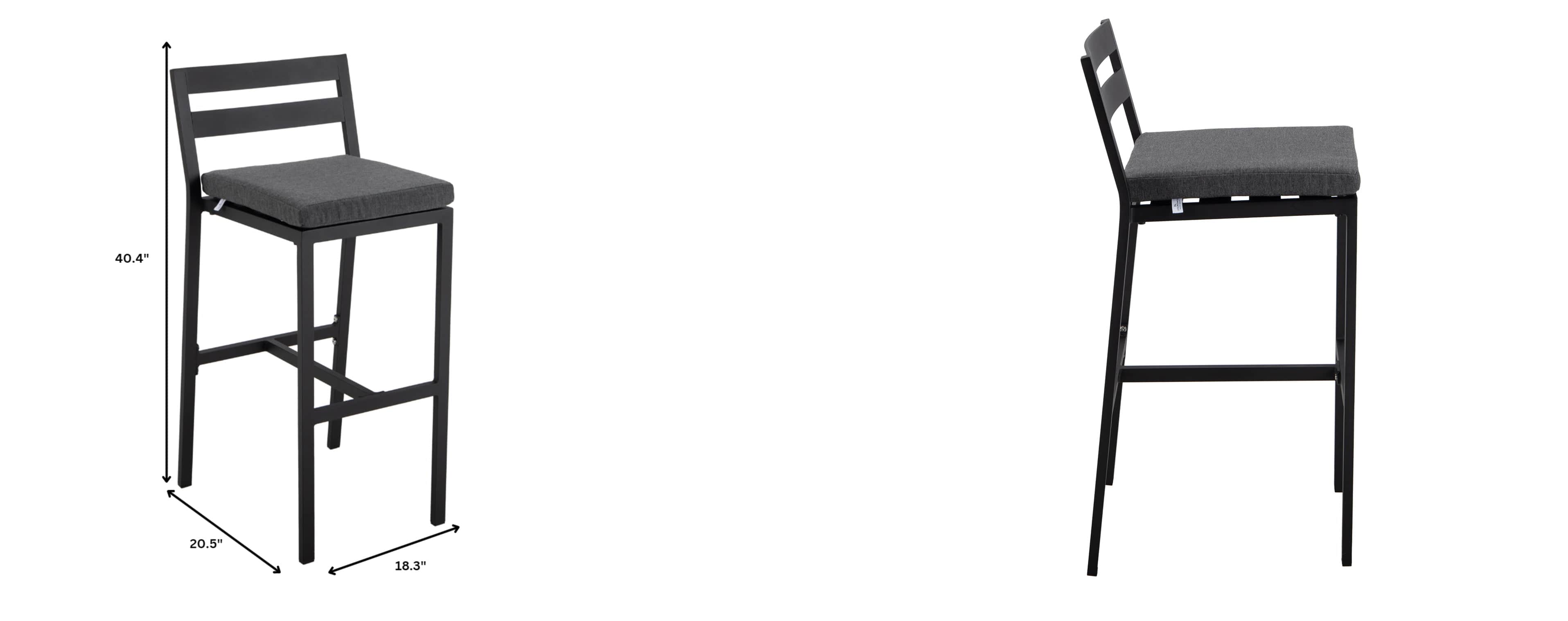 Introducing the Chelsea Modern Patio Bar Chair! Made with powder-coated aluminum for durability and a removable cushion for easy cleaning. Enjoy comfortable outdoor seating in style.