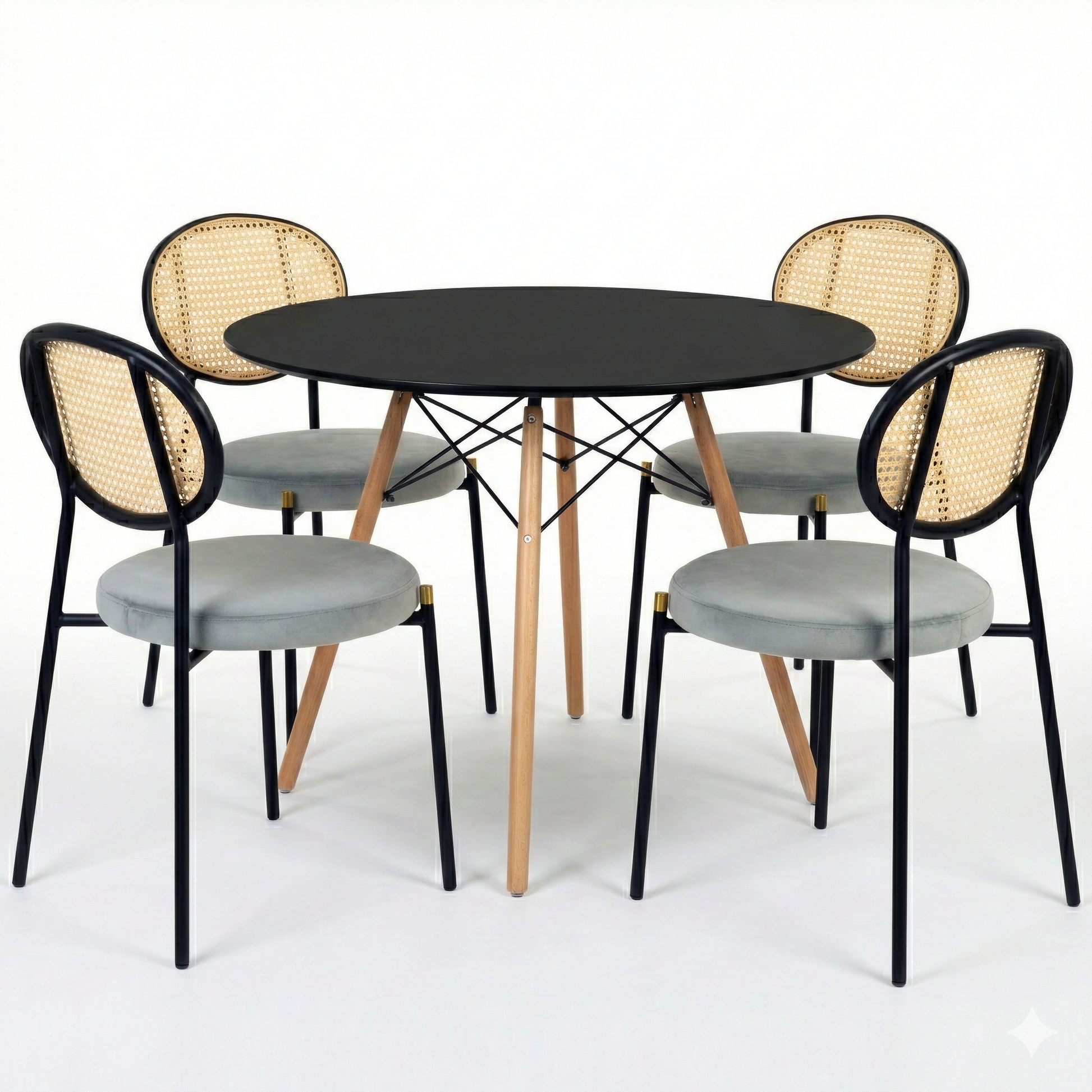 - The four chairs have soft velvet or leather upholstery, 6cm thick high-density sponge seat padding, and breathable wicker backrests for both comfort and elegant appearance.