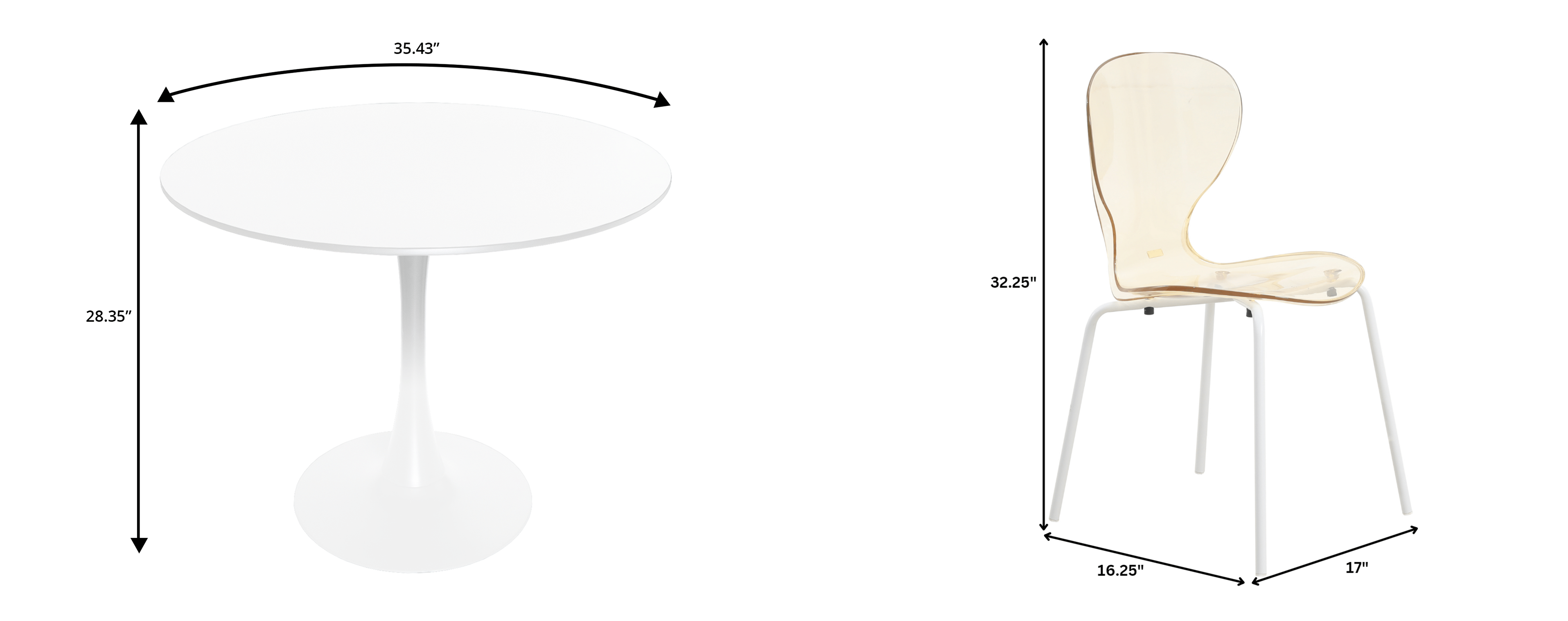 Elevate your dining experience with the modern and stylish LeisureMod 5-Piece Dining Set. The round MDF table and acrylic chairs with white bases create a clean and contemporary look. Transform your space and impress your guests with this chic dining set.