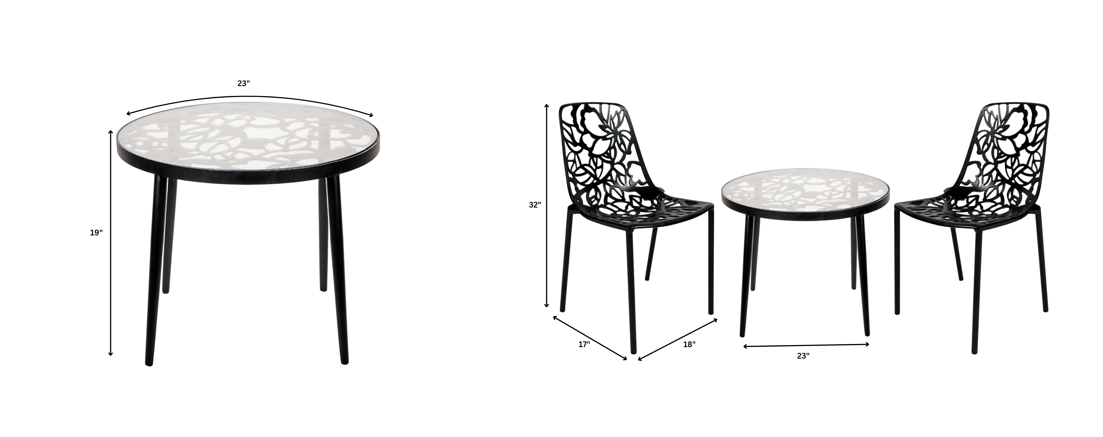 Introducing the Devon Outdoor Patio Dining Set its captivating floral design enhances home aesthetics. The aluminum frame ensures strength and mobility for effortless guest accommodation or rearrangement. The high-quality tempered glass top provides a sleek dining surface. Versatile for indoor and outdoor settings.