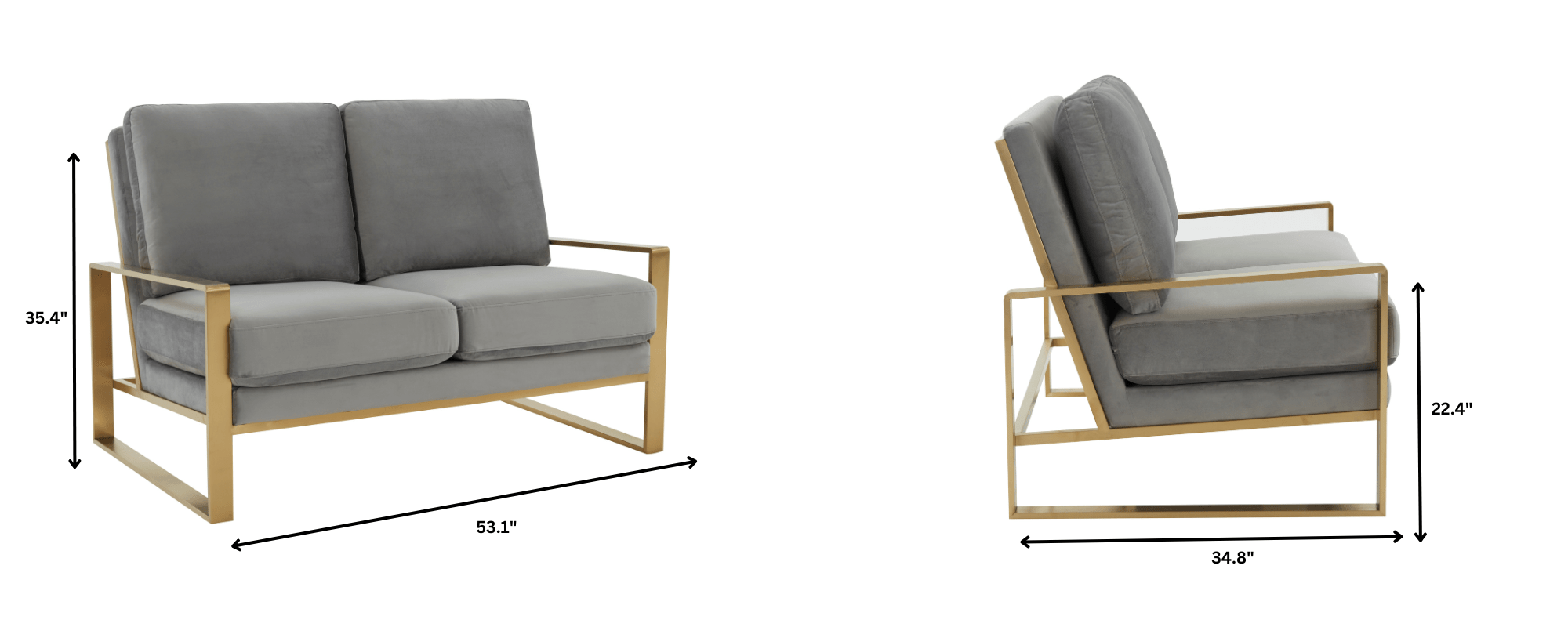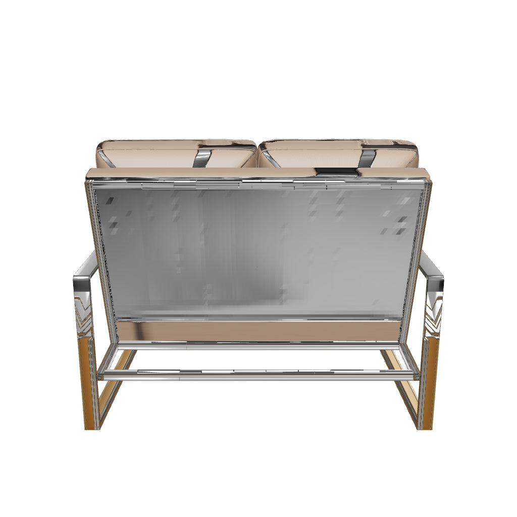 Elevate your home with the Gold Mirrored Frame Contemporary Velvet Loveseat from the Jefferson Collection. Its neutral velvet upholstery and sturdy gold metal frame bring luxurious sophistication to any room. With a generous seat size and comfortable armrests, this loveseat offers the perfect spot to relax. Its easy-to-maintain fabric makes it a practical yet stylish choice for any living room, bedroom, or office.