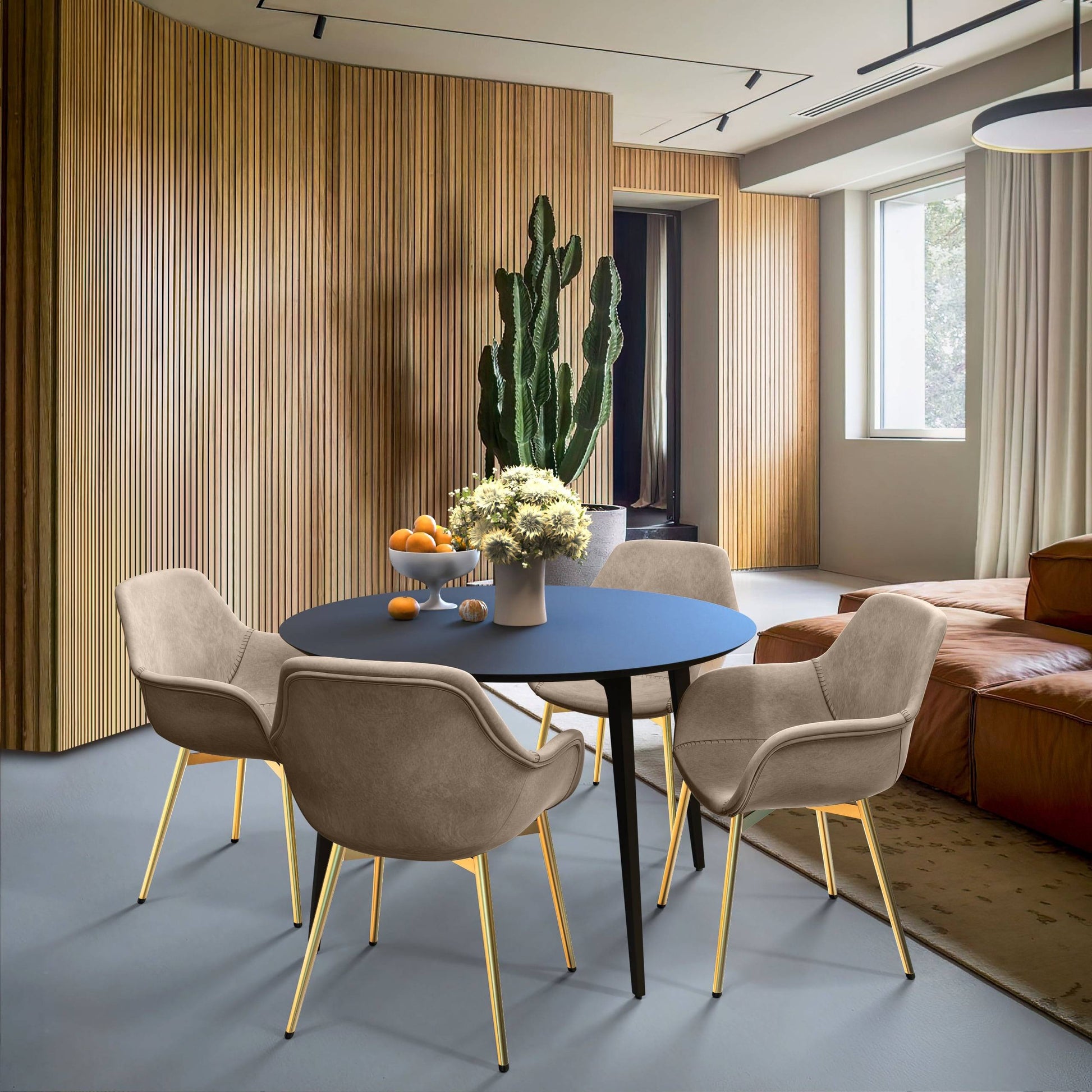 - Ergonomic seat with curved backrest and armrests blends comfort and sleek design, ideal for modern dining rooms and interiors.