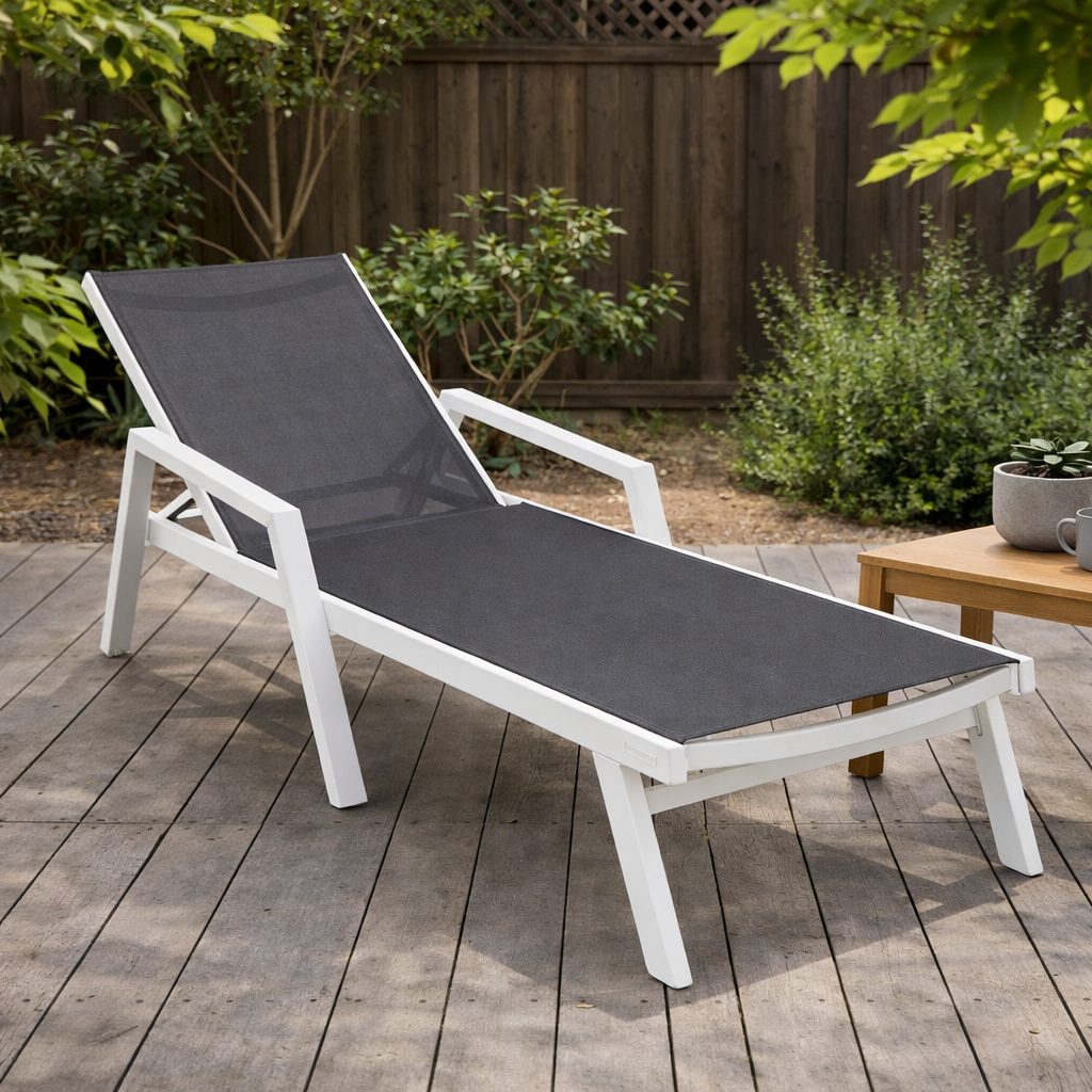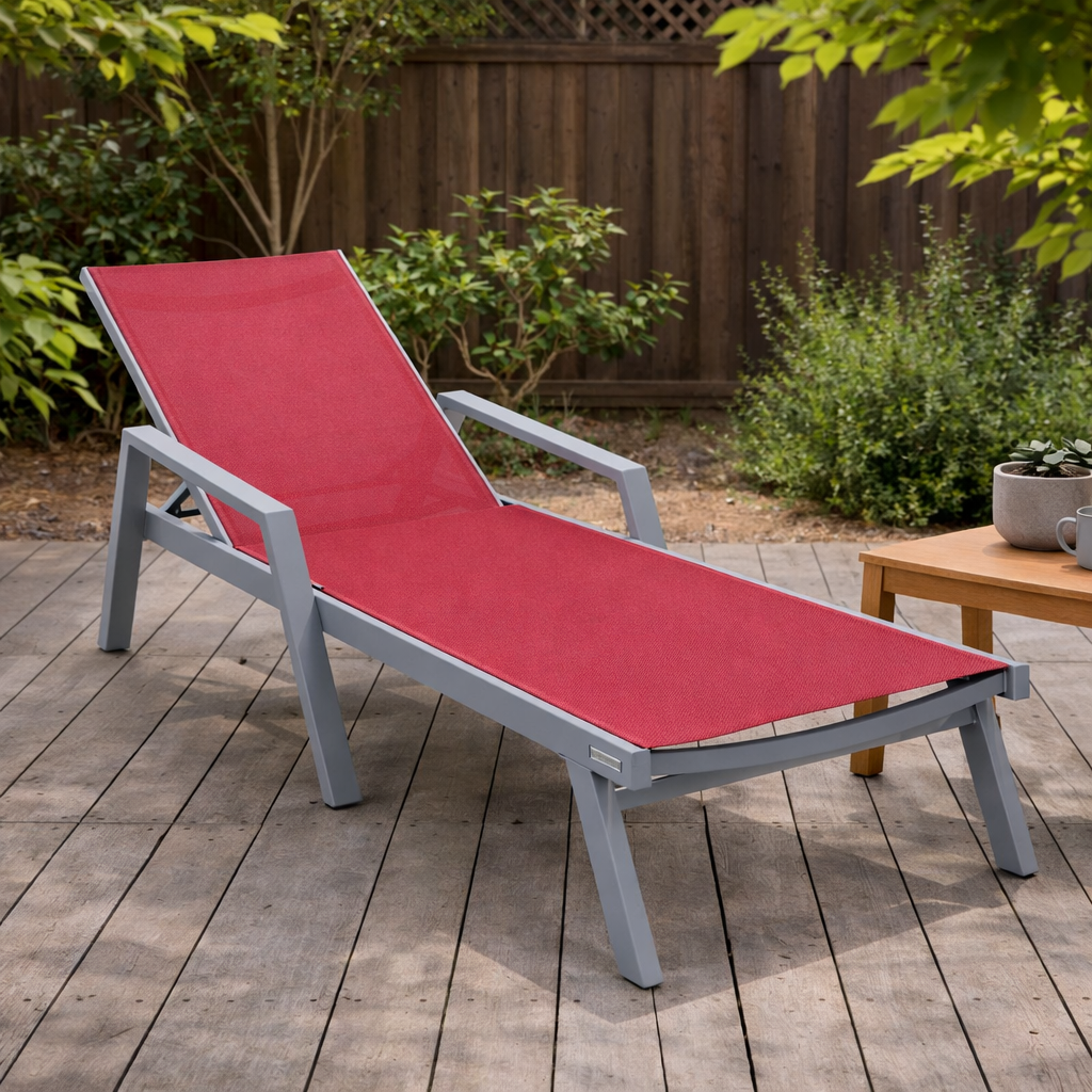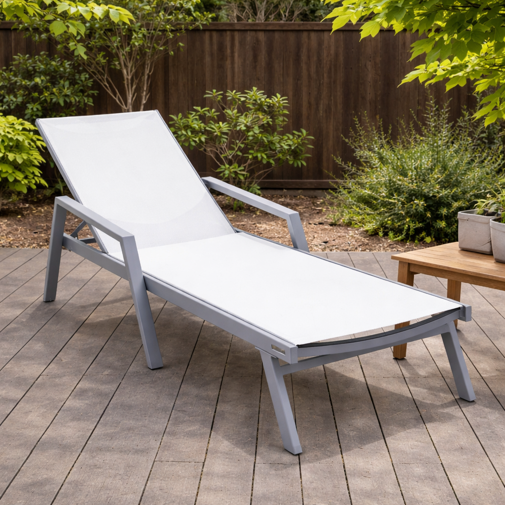 Elevate your outdoor oasis with the Marlin Outdoor Chaise Lounge Chair from LeisureMod. The powder-coated aluminum frame and breathable mesh sling-back provide weather-resistant comfort, while the four-position adjustable backrest offers personalized relaxation. With a UV-protected finish, non-slip foot pads, and easy assembly, this stylish and sturdy chair is designed for maximum support and minimum maintenance.