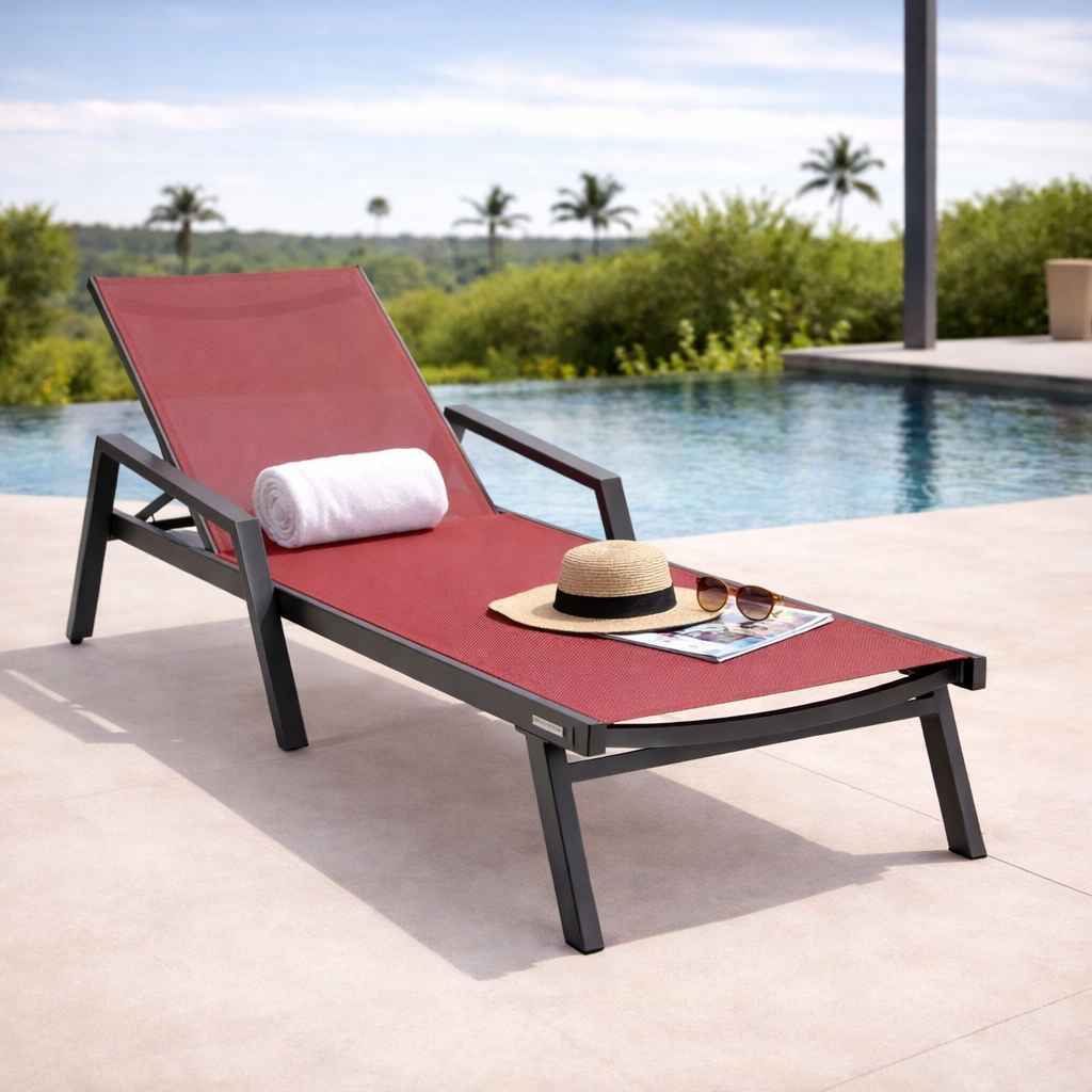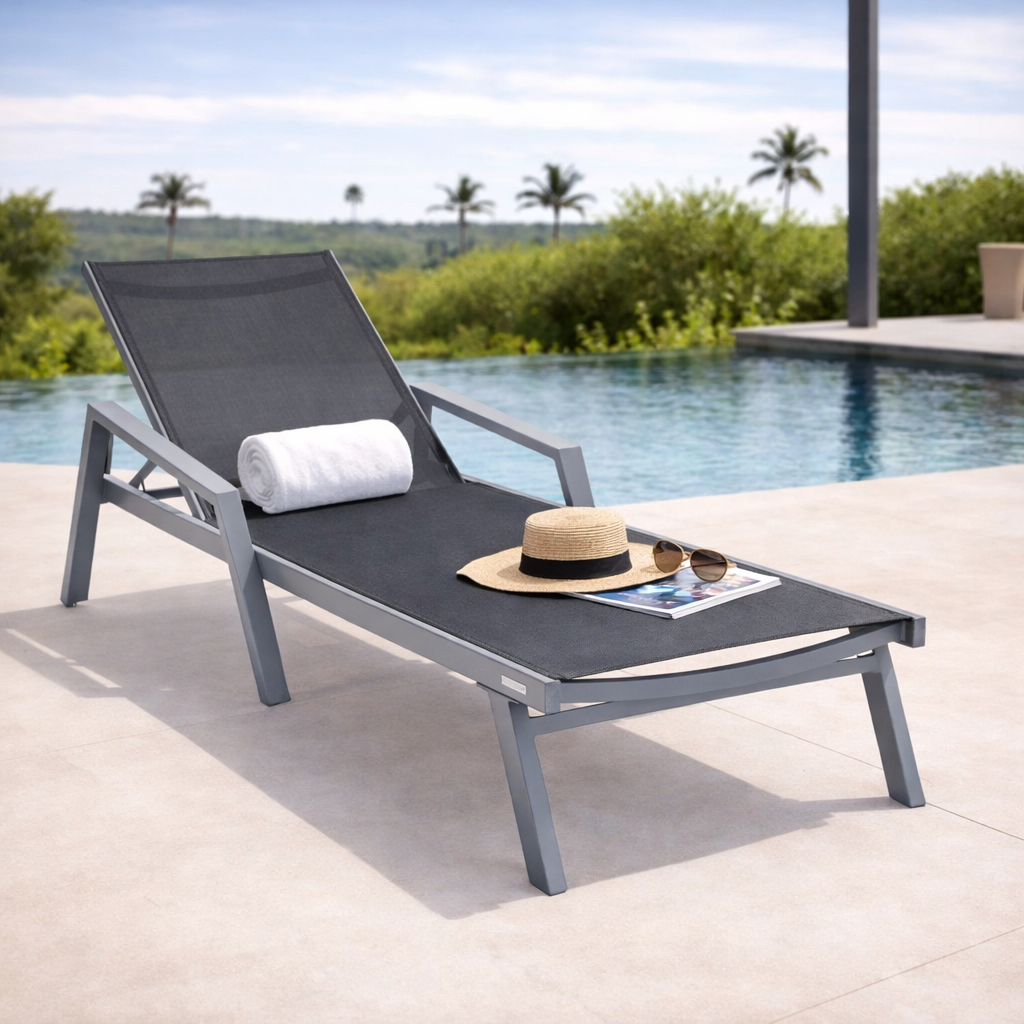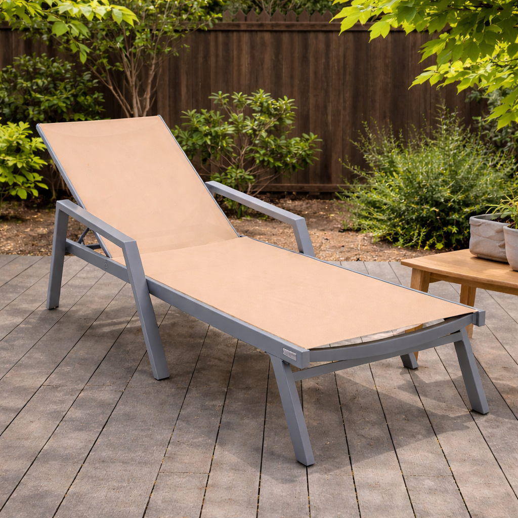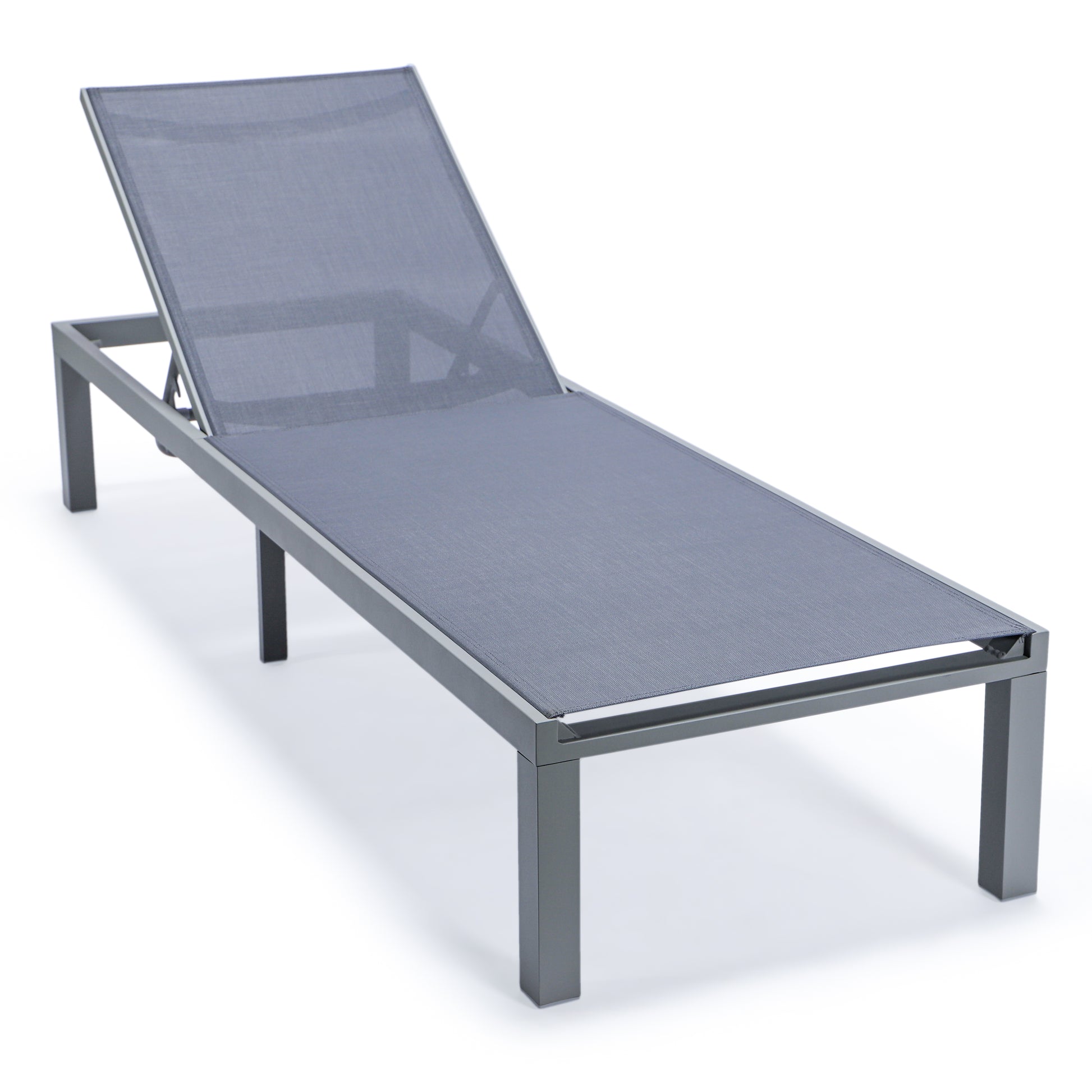Elevate your outdoor oasis with the Marlin Outdoor Chaise Lounge Chair from LeisureMod. The powder-coated aluminum frame and breathable mesh sling-back provide weather-resistant comfort, while the four-position adjustable backrest offers personalized relaxation. With a UV-protected finish, non-slip foot pads, and easy assembly, this stylish and sturdy chair is designed for maximum support and minimum maintenance.