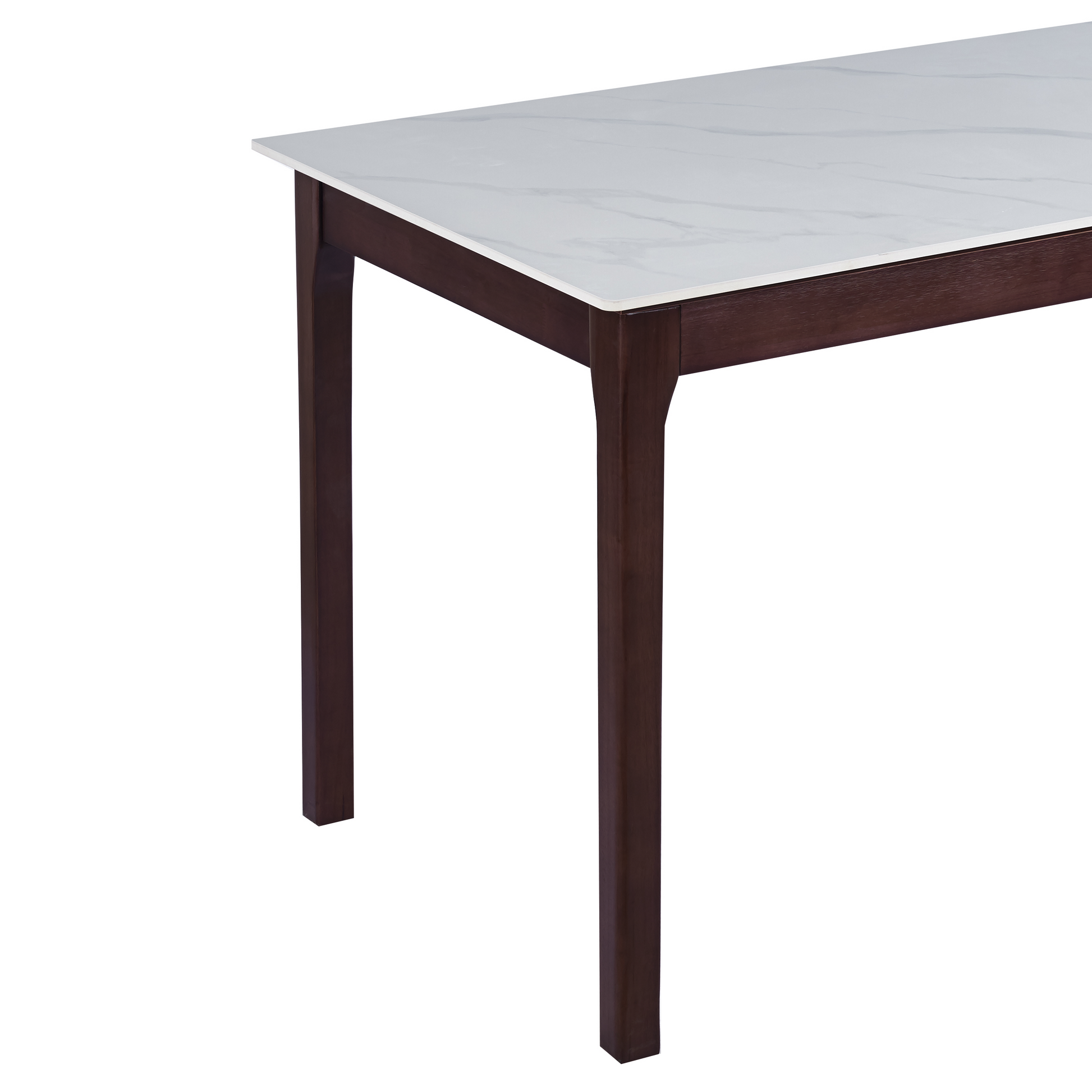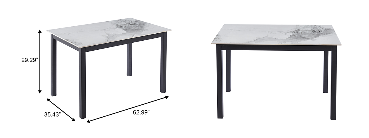 Modern dining table with sintered stone tableop that resists scratches, heat, and stains. Sturdy metal and wood base seats 4-8 people with 440 lb weight capacity. Available in four sizes for any space. Easy assembly, perfect for families and entertaining.