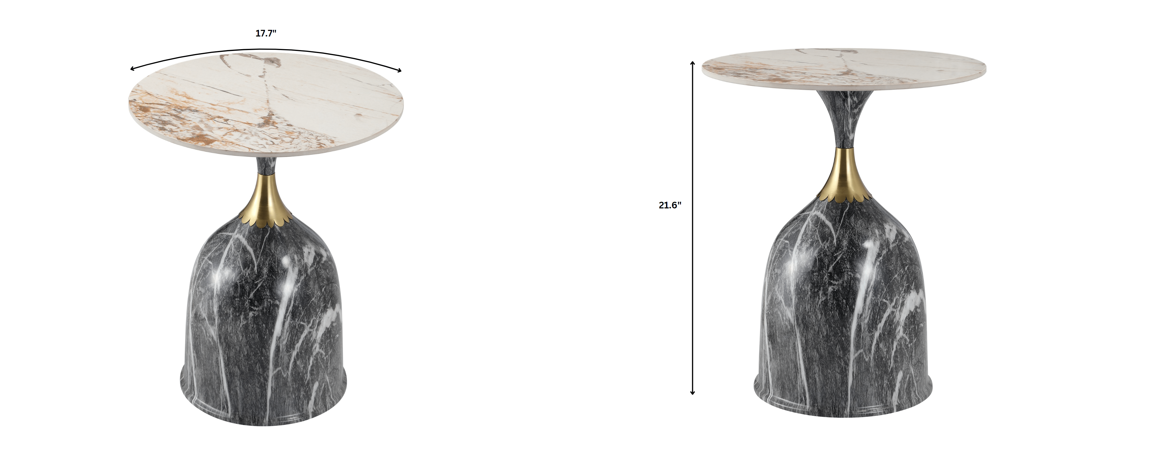 A modern side table design, smooth tabletop, and bell-shaped steel base connected by a gold-colored neck. Choose from sintered stone or stainless-steel tabletops. The sturdy steel pedestal base ensures stability. Versatile and easy to maintain, no assembly required.