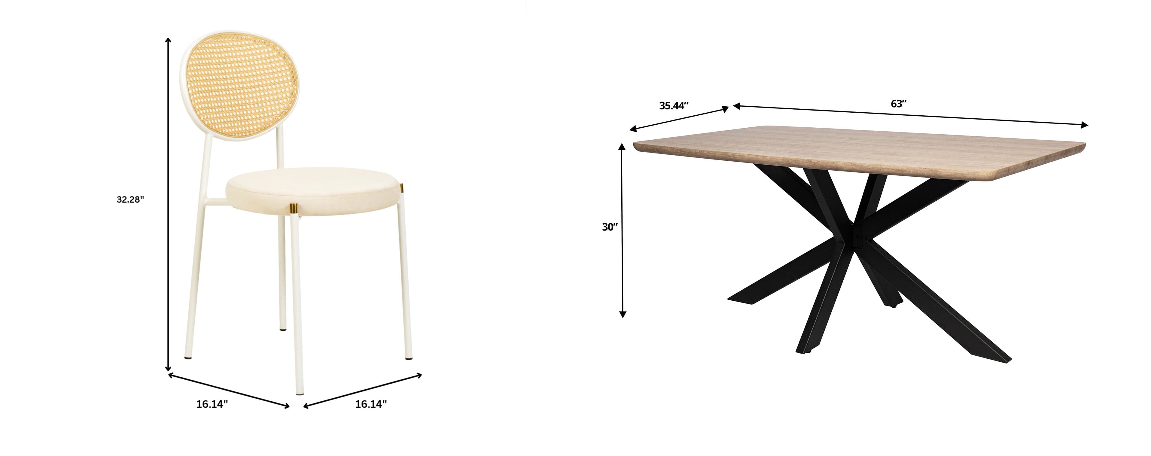 Elevate your dining experience with the Ravenna 5-Piece Dining Set. The 63" rectangular table in maple exudes elegance and durability, while the 4 white steel leg chairs offer both comfort and style with their velvet upholstery. Indulge in luxurious dining at home with this beautiful set.
