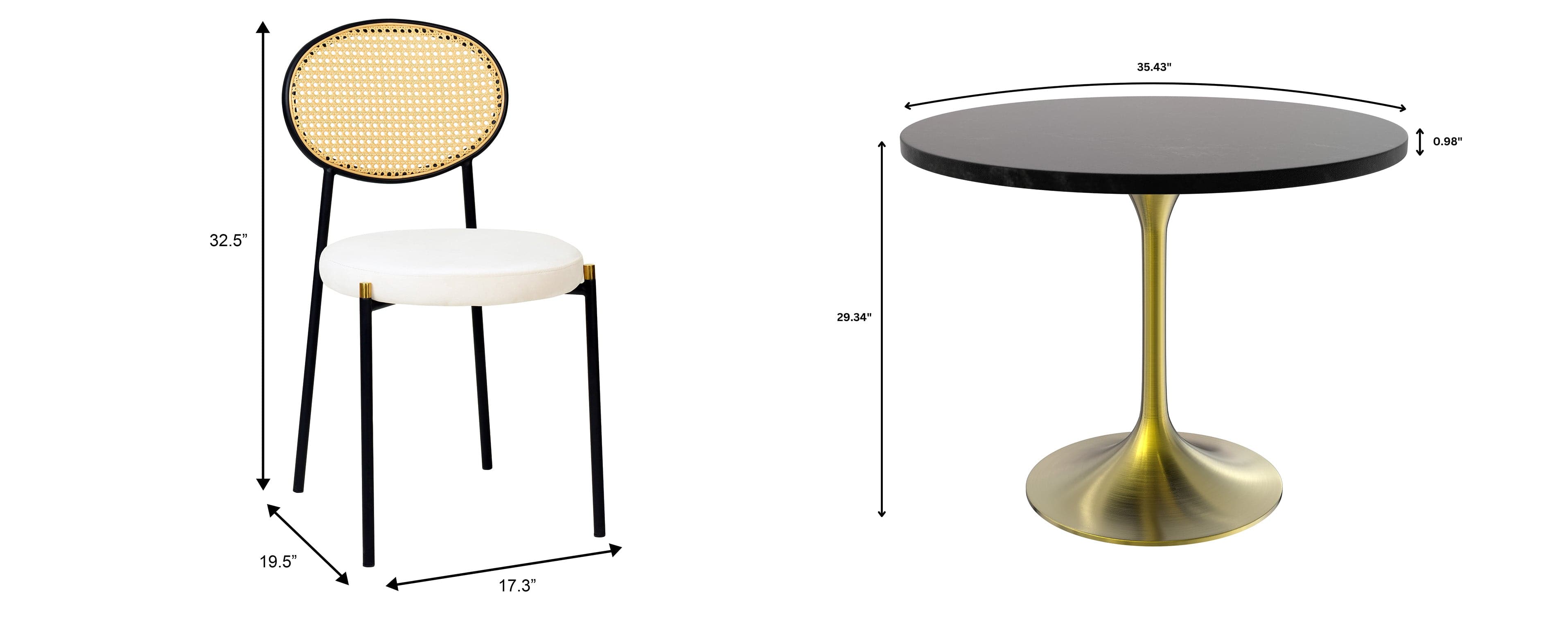 Add a touch of elegance to your dining space with the Verve 5-Piece Dining Set. The 36" round table features a sleek black MDF top and a gold base, while the 4 velvet dining chairs boast black steel legs for a modern look. Elevate your dining experience with this stylish and sophisticated set.