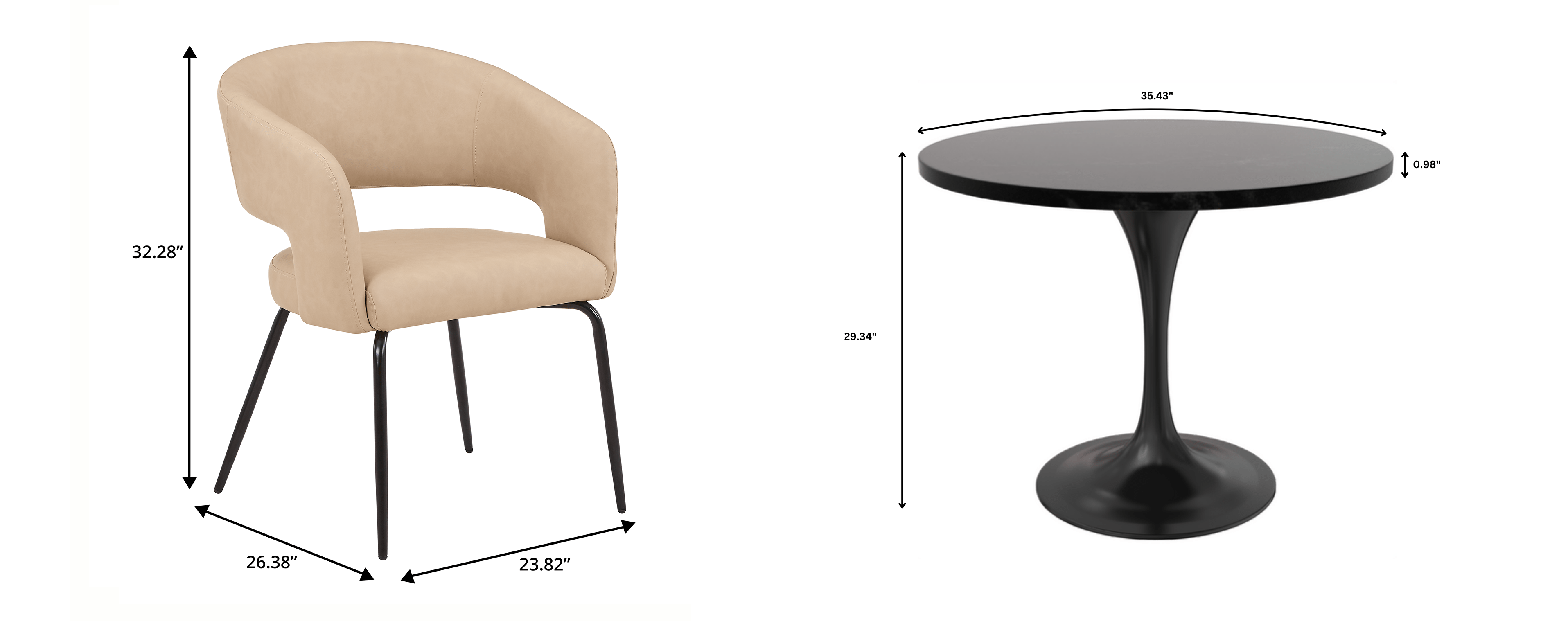 This 5-piece dining set includes a stylish 36" round table with a sleek black MDF top and 4 comfortable dining chairs upholstered in a luxurious velvet/leather combination. Perfect for small dining spaces, this set adds sophistication and functionality to any home.