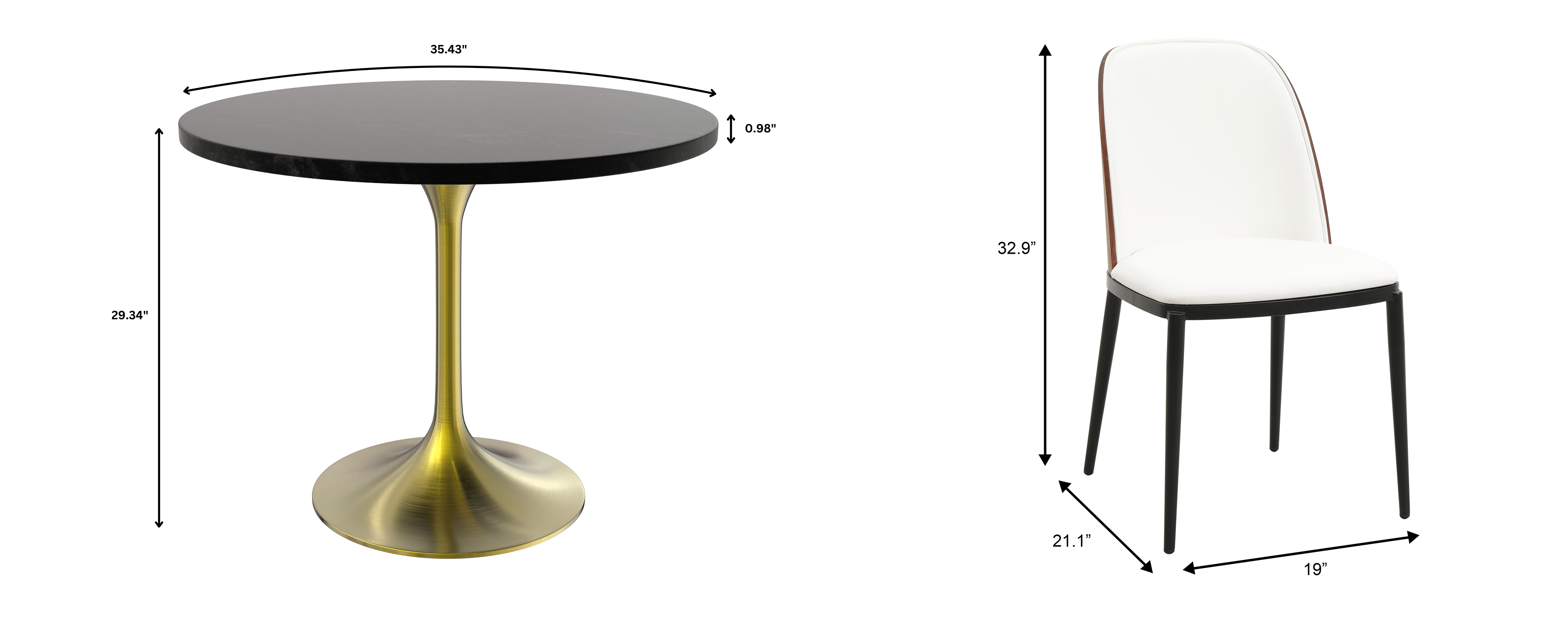 Elevate your dining experience with the Verve 5-Piece Dining Set. The 36" round MDF top table and 4 leather dining side chairs offer a sleek and stylish design while providing durability and comfort. Enjoy intimate meals or entertain guests in style with this elegant set.