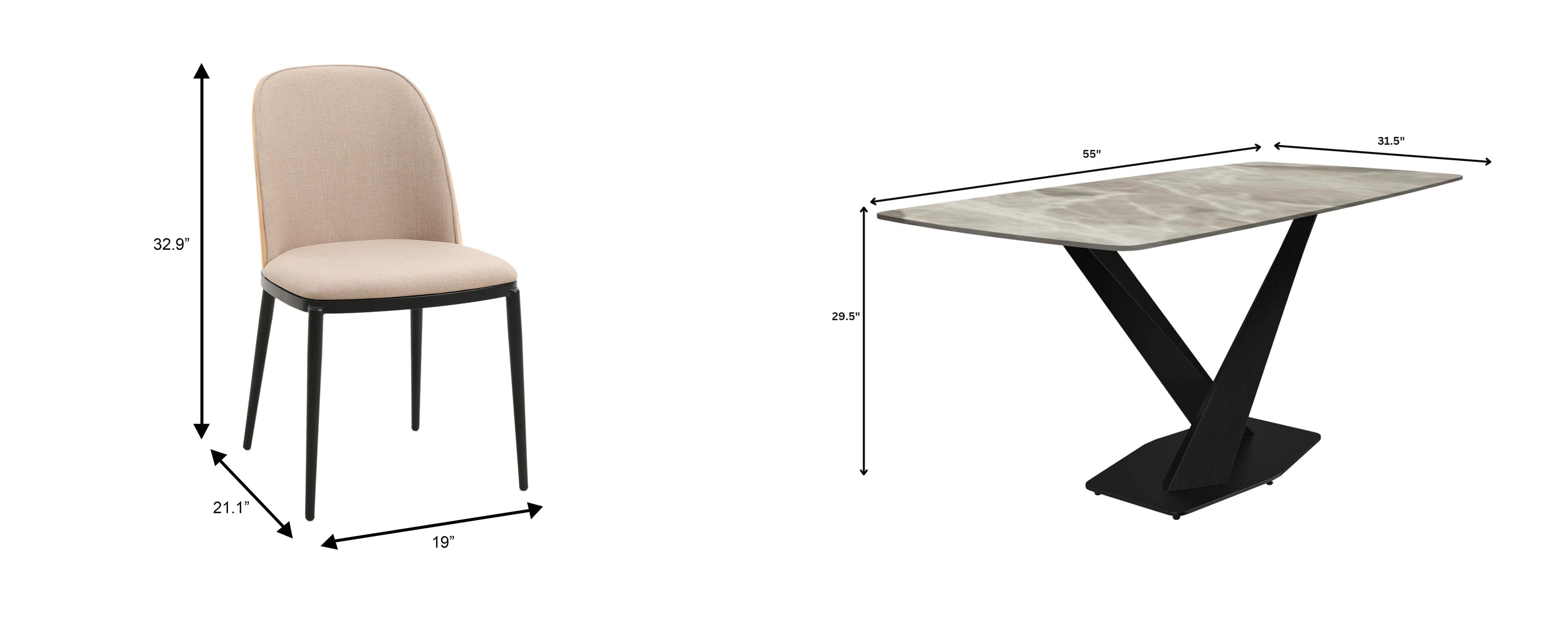 Elevate your dining experience with the Voren 7-Piece Dining Set. The sleek 55" rectangular table in deep grey sintered stone exudes sophistication, while the 6 dining chairs in leather, velvet, or suede fabric provide both comfort and elegance. This set is perfect for hosting gatherings and adding a touch of luxury to your home.