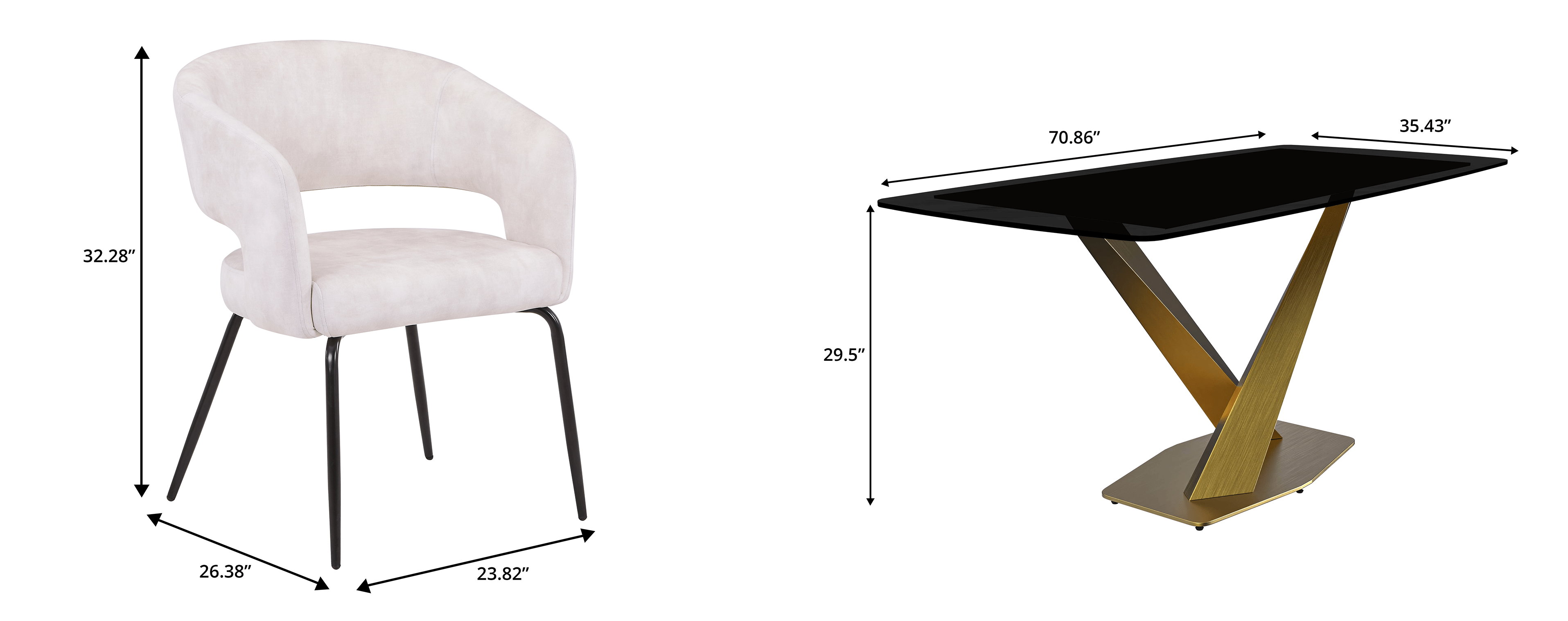 Create a luxurious dining experience with the Voren 7-Piece Dining Set! The sleek rectangular glass dining table, accented by a stunning gold base, comfortably accommodates 6 guests. The plush velvet dining chairs, featuring sturdy iron bases, add a touch of elegance and comfort. Elevate your dining space with this exquisite set.
